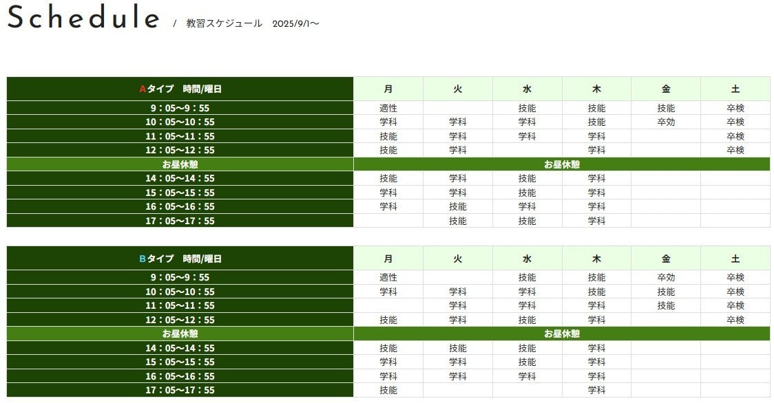 10:05~10:55 | 学科 | 学科 | 学科 | 技能 | 技能 | 卒検 |