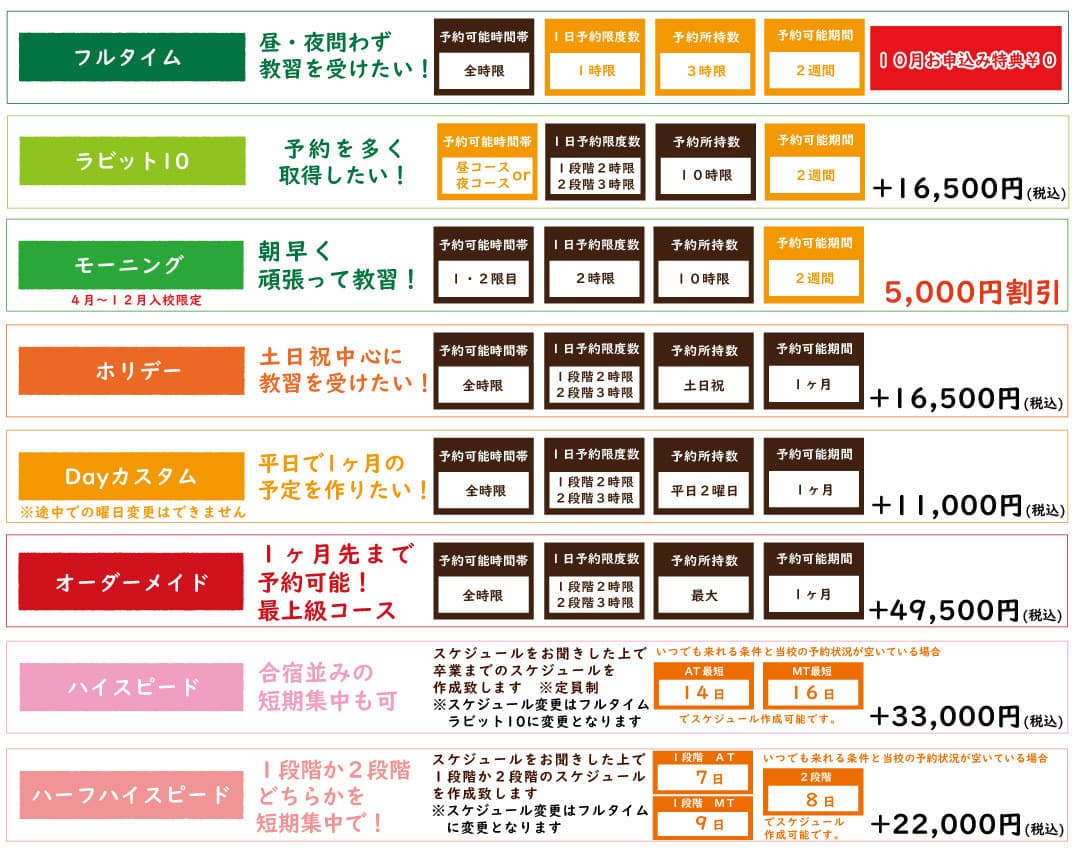 ※途中でも加入可能ですが、加入時点で発生している追加料金(技能延長分、効果測定料、検定料+補習料等)をお支払いの上、途中加入が可能です
