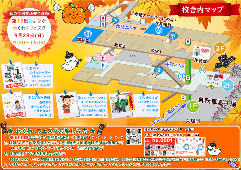 ※当日9時30分より→LINEにてデジタル整理券取得可←(子供免許証70分、バッテリーカー10分、ミニ消防ポンプ車15分、自転車シミュレーター15分、数に限りがある為、時間重複して予約しないでください)